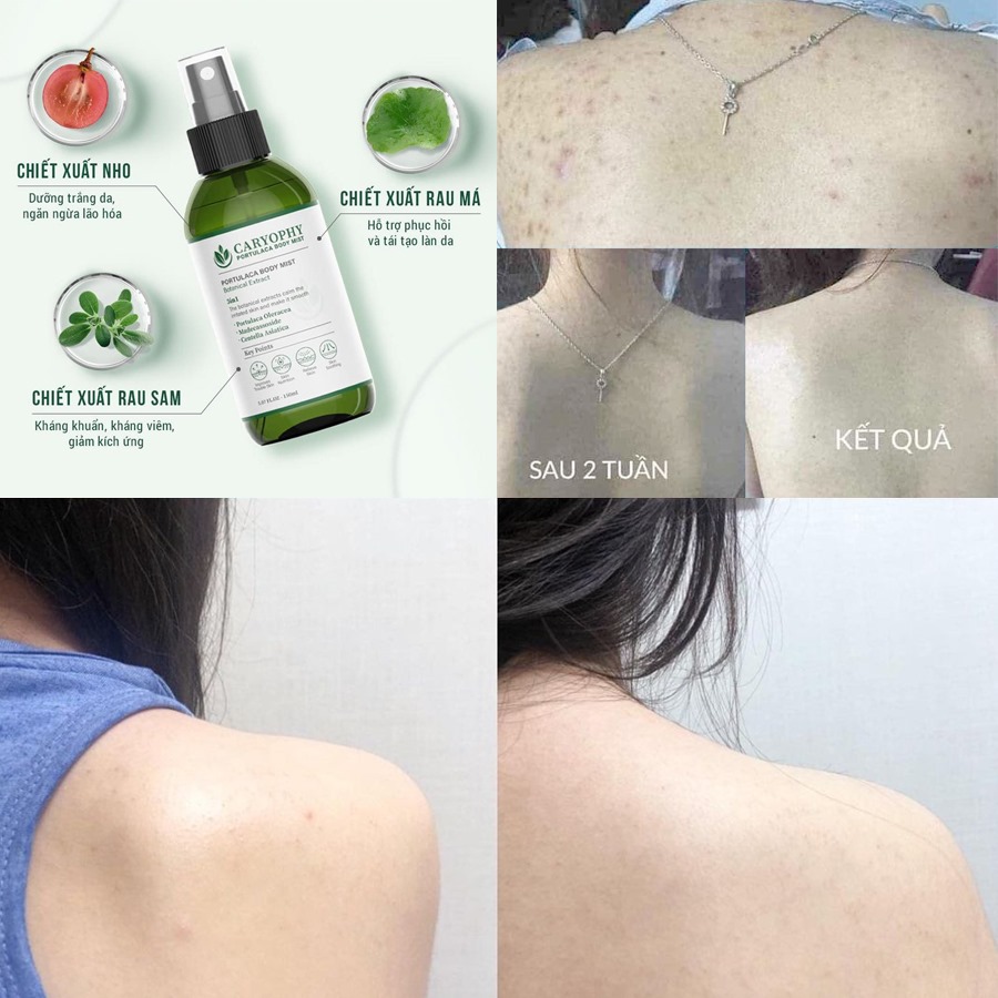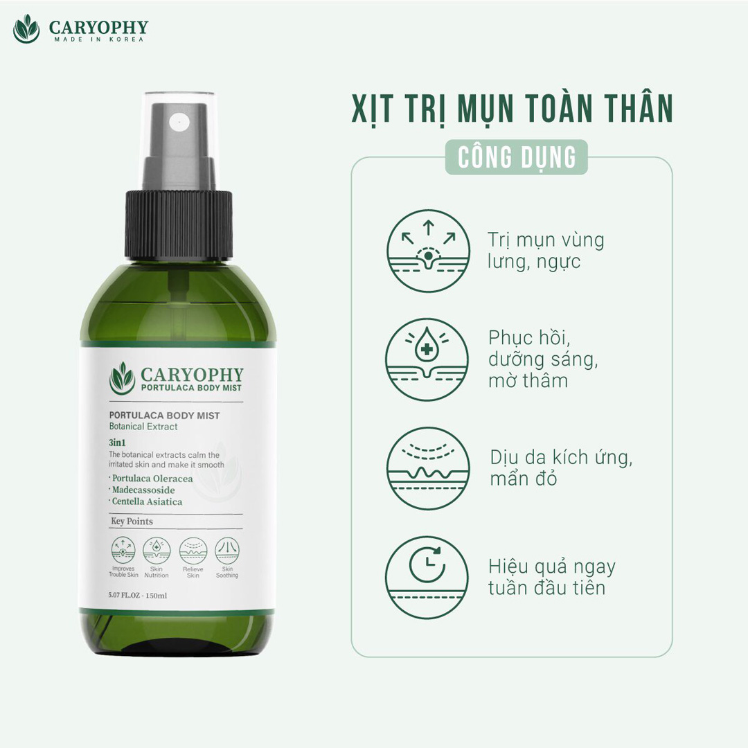 Xịt Giảm Mụn Toàn Thân Caryophy Portulaca Body Mist là sản phẩm chuyên biệt giúp làm giảm mụn - mờ thâm dành cho da cơ thể đến từ thương hiệu CARYOPHY của Hàn Quốc. Công thức với các thành phần tự nhiên chiết xuất chính từ rau sam, rau má và nho giúp làm giảm các loại mụn sưng đỏ, viêm ngứa, làm dịu da, kháng viêm ở các vị trí lưng, ngực,… hiệu quả. Thiết kế dạng chai xịt tiện lợi, dễ sử dụng. Sản phẩm được nghiên cứu và kiểm định đáp ứng nhu cầu sử dụng cho mọi loại da kể cả da nhạy cảm.