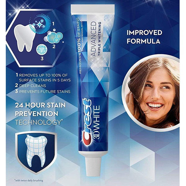 - Dòng Crest 3D White triple Advanced là phiên bản nâng cấp dòng Crest 3D White Advanced, Công nghệ làm trắng vượt trội gấp 3 lần so với các dòng Crest 3D White khác