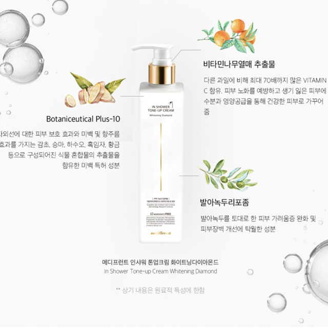 Bên cạnh làm sạch da như các loại sữa tắm thông thường, Sữa tắm truyền trắng Medifferent In Shower Tone Up Cream còn có nhiều dưỡng chất có tác dụng chăm sóc da, cân bằng độ ẩm. Sản phẩm thích hợp với các cô nàng hiện đại bị hạn chế về thời gian. Không cần kem dưỡng thể, không cần mất thời gian thoa kem, làm sạch….bạn vẫn có thể sở hữu một làn da trắng đẹp mịn màng.