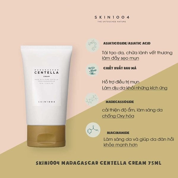 - Kem Dưỡng Hỗ Trợ Trị Mụn, Phục Hồi Da Mụn Chiết Xuất Rau Má Skin1004 Madagascar Centella Cream chứa thành phần TECA chiết xuất từ rau má bao gồm 4 hợp chất chính (Asiatic Acid/Madecassic Acid/ Asiaticoside/ Madecassoside) giúp thúc đẩy quá trình hình thành các mô tế bào da, làm dịu và lành da, hạn chế các vết thâm. Làm chậm quá trình làm sạm da, lão hóa da, cấp ẩm cho da một cách hiệu quả. Đặc biệt còn có công dụng giảm mụn.