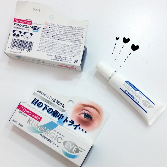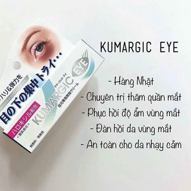- Kem Cream Kumargic eye được chiết xuất hoàn toàn từ thiên nhiên, dễ dàng thấm sâu vào các tế bào da và kết hợp với các tinh thể thủy tinh 7 giúp tạo độ phản quang, che lấp khuyết điểm và quầng thâm mắt khi trang điểm.