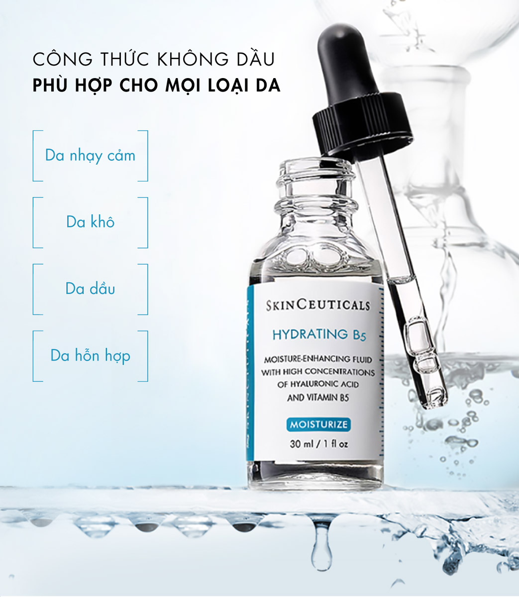 SkinCeutical B5 nổi bật với chứa vitamin B5 có công dụng giúp dưỡng ẩm, phục hồi cho làn da mụn, da nhạy cảm dễ lên mụn, giúp duy trì độ ẩm cho da. Hyaluronic acid giúp cấp nước cho da, thành phần cấp ẩm giúp tăng khả năng hấp thụ nước gấp 1000 lần cho làn da của bạn.