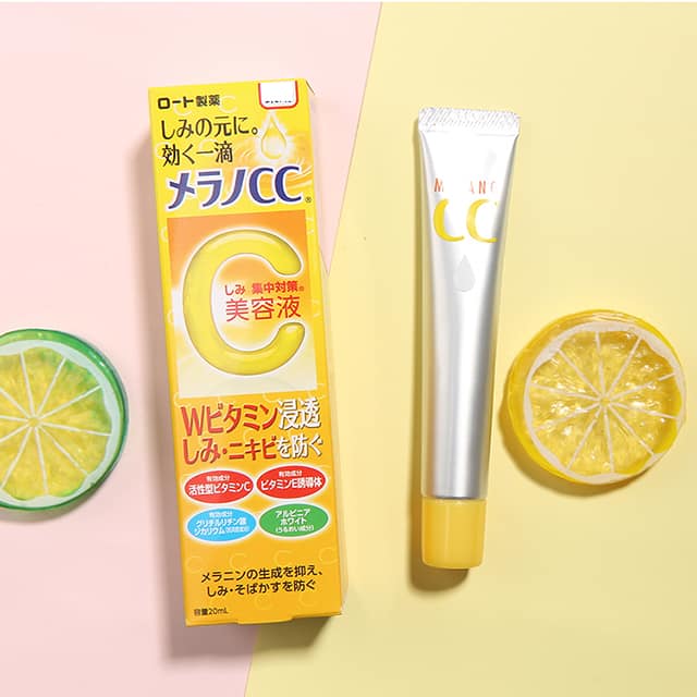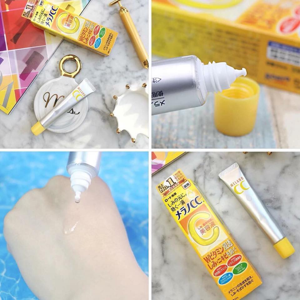 - Tinh chất Melano CC Rohto kết hợp giữa vitamin C và E giúp ngăn chặn sự sản xuất melanin (tác nhân gây ra vết thâm nám, tàn nhang).