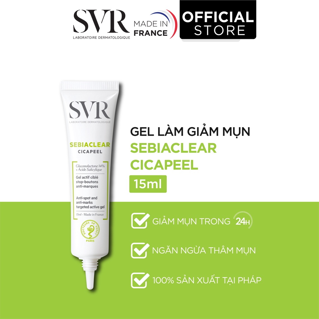 SVR SEBIACLEAR Cicapeel là giải pháp cứu cánh cho làn da mụn. Gel giảm mụn hoạt động suốt 24 giờ nhằm làm khô và loại bỏ mụn đồng thời ngăn chặn việc hình thành các vết thâm. Chất gel trong suốt lưu giữ cả ngày dài. Dành cho làn da mụn nhạy cảm.