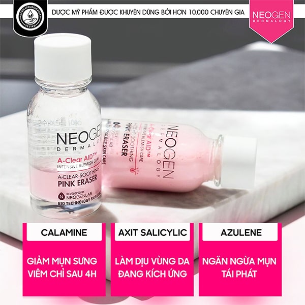 Các nốt mụn sưng viêm bỗng dưng xuất hiện trên da luôn là vấn đề khiến phái đẹp "đau đầu". Với Dung Dịch Chấm Mụn Neogen Dermalogy A-Clear AID Soothing Pink Eraser, mụn sẽ không còn là nỗi lo lắng nữa. Sản phẩm chứa thành phần chính là Sulfur, Salicylic Acid, chiết xuất Hoa Cúc được bào chế ở dạng dung dịch lỏng, dịu nhẹ, không gây kích ứng và không có tính bào mòn da, phù hợp để sử dụng hằng ngày.