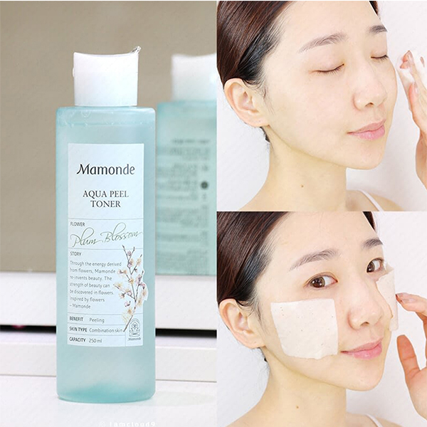 Về thành phần, Mamonde Aqua Peel Toner Plum Blossom có chứa chiết xuất hoa mận - Plum Blossom và thành phần AHA tự nhiên, giúp dưỡng ẩm sâu, tẩy nhẹ nhàng các tế bào chết trên da, ngăn ngừa mụn ẩn, hạn chế tích tụ bã nhờn và chống lão hóa.