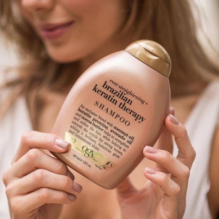 • OGX Brazilian Keratin Therapy giàu chất dưỡng ẩm giúp nuôi dưỡng, phục hồi tóc từ sâu bên trong, cho mái tóc mềm mại, tạo độ đàn hồi, chắc khỏe, óng ả cho tóc