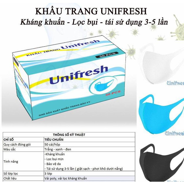 - Khẩu trang Unifresh với thiết kế thông minh từ công nghệ Nhật chống khuẩn tối đa, ngăn chặn khói bụi thâm nhập vào các khe hở, gia tăng mức độ phòng chống bụi, vi khuẩn trong không khí.hông khí.