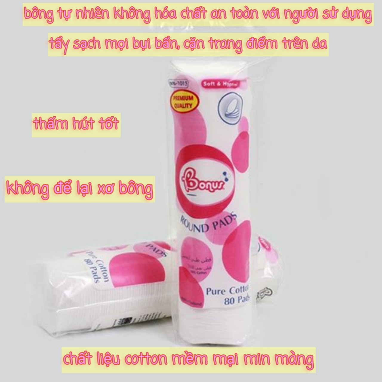 - Bông tẩy trang Bonus được làm từ chất liệu Cotton hữu cơ có bề mặt mềm mại, mịn màng, không gây tổn thương, trầy xước khi tiếp xúc với da.