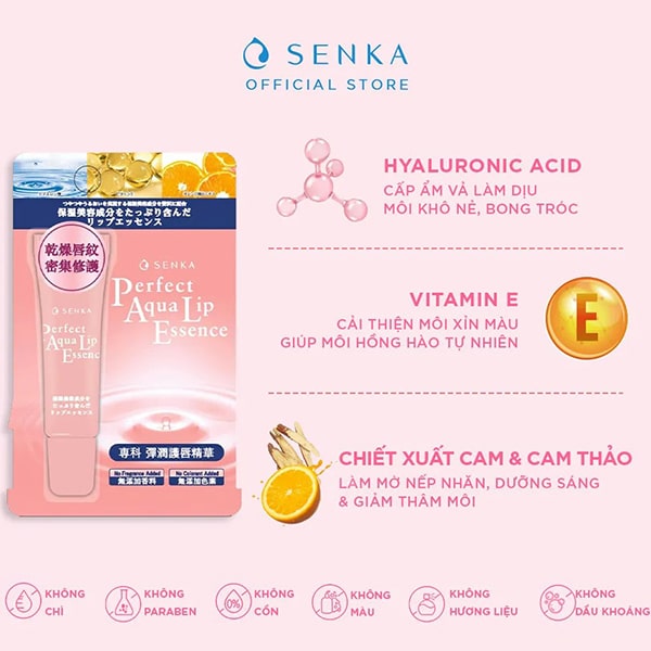 • Son Dưỡng Cấp Ẩm Ban Đêm Senka Perfect Aqua Lip Essence là dòng son dưỡng không có chứa cồn, chì, không chứa hương liệu, paraben và không chứa dầu khoáng. Đây là dòng son được đánh giá cao về độ lành tính, an toàn cho đôi môi. Dòng son này sở hữu mùi hương cam nhẹ nhàng.