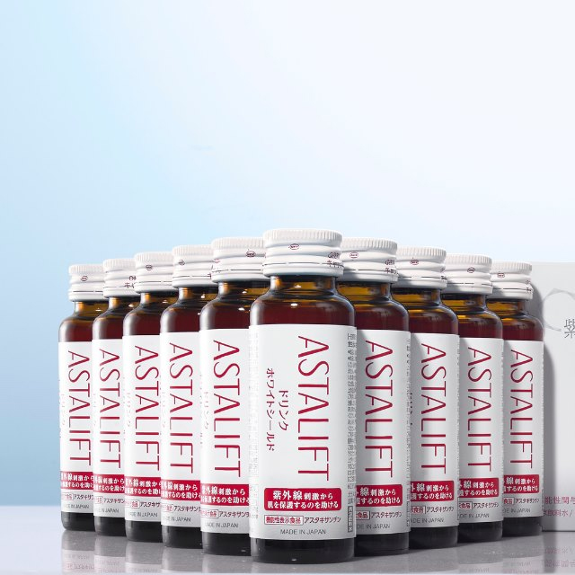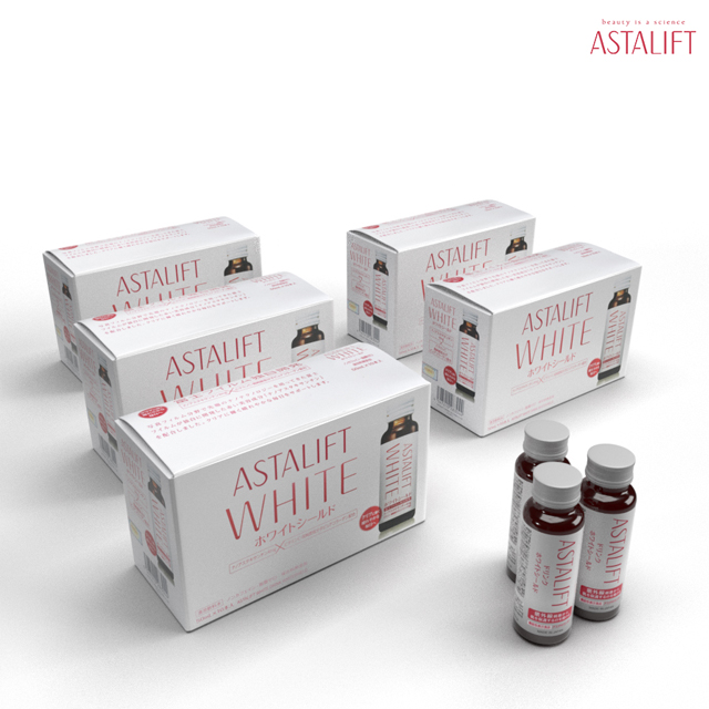 - Thức uống làm trắng sáng da Astalift White Drink Whiteshield chứa các thành phần Nano Astaxanthin – được sáng chế độc quyền từ Fujifilm. Chúng sở hữu một kích thước cực nhỏ, bé hơn 10nm, từ đó làm gia tăng khả năng hấp thụ dưỡng chất của cơ thể đến 1.6 lần.