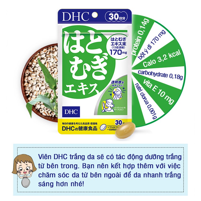 Thành phần chính của viên uống trắng da bao gồm: Chiết xuất lúa mạch, Vitamin E, bột giải nén COIX, sáp ong…