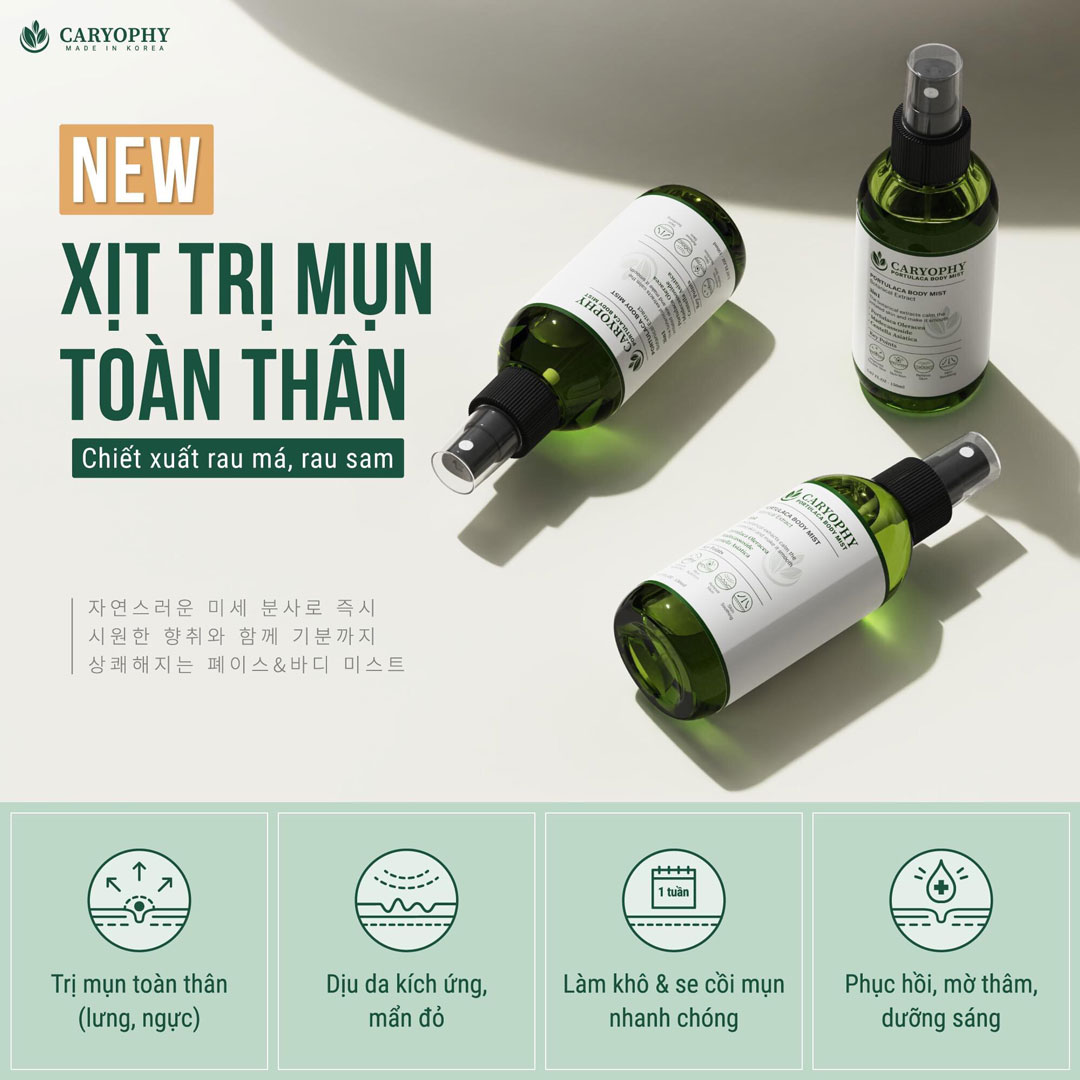 Xịt Giảm Mụn Toàn Thân Caryophy Portulaca Body Mist là sản phẩm chuyên biệt giúp làm giảm mụn - mờ thâm dành cho da cơ thể đến từ thương hiệu CARYOPHY của Hàn Quốc. Công thức với các thành phần tự nhiên chiết xuất chính từ rau sam, rau má và nho giúp làm giảm các loại mụn sưng đỏ, viêm ngứa, làm dịu da, kháng viêm ở các vị trí lưng, ngực,… hiệu quả. Thiết kế dạng chai xịt tiện lợi, dễ sử dụng. Sản phẩm được nghiên cứu và kiểm định đáp ứng nhu cầu sử dụng cho mọi loại da kể cả da nhạy cảm.