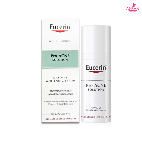 Eucerin Pro ACNE Solution Day Mat Whitening SPF 30 là kem dưỡng trắng, chống nắng cho da mặt với công thức đặc biệt dành cho da dầu, mụn, bảo vệ da mặt khỏi thương tổn do ánh nắng, đồng thời chứa hoạt chất cải thiện tình trạng da
