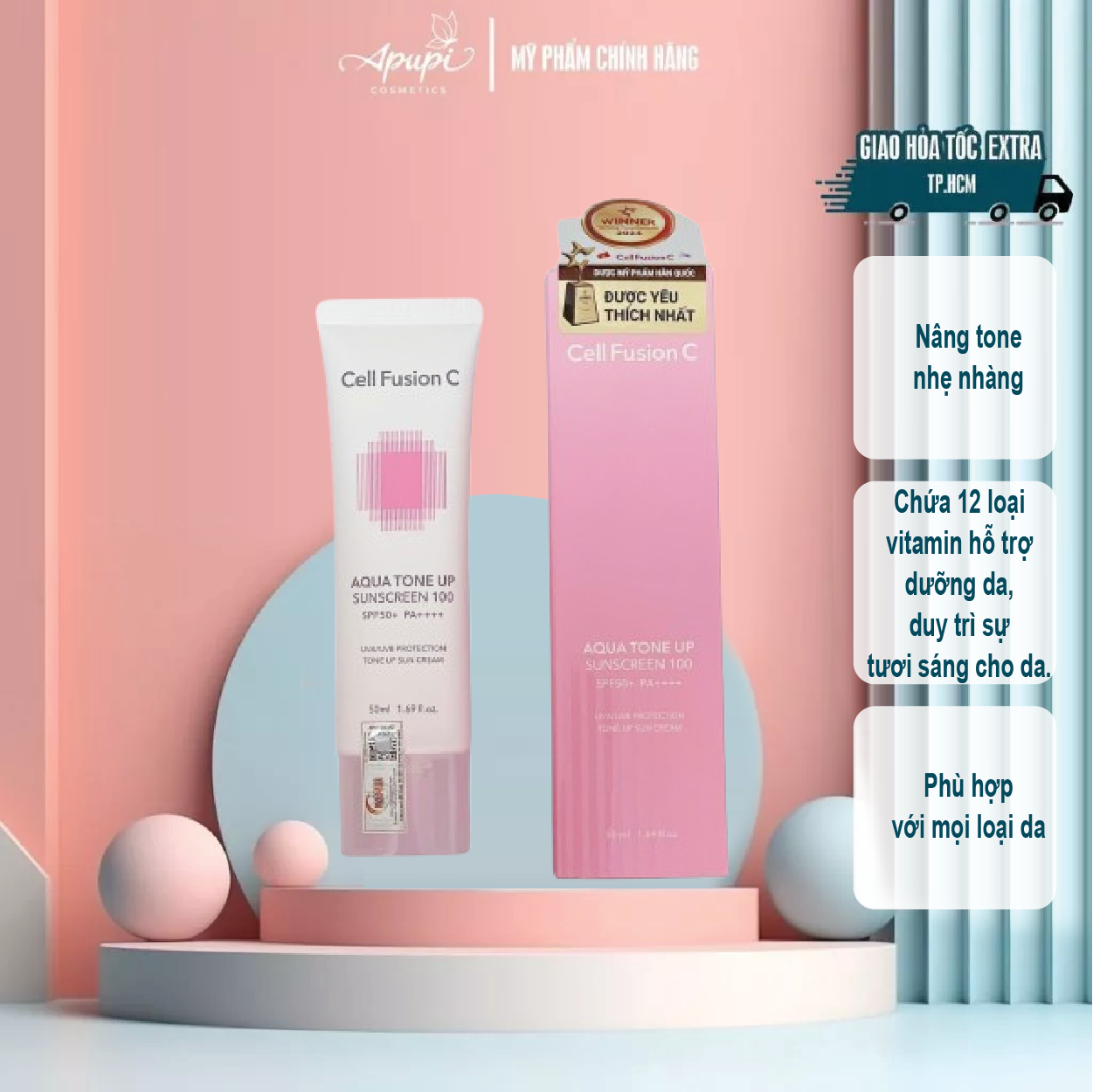 Kem Chống Nắng Cell Fusion C Nâng Tông Cấp Ẩm Aqua Tone Up 100 Sunscreen SPF 50+ PA++++ là sản phẩm chống nắng da mặt đến từ thương hiệu Cell Fusion C - Hàn Quốc, giúp bảo vệ da toàn diện trước tác động của tia UVA, UVB và ánh sáng xanh. Cell Fusion C Aqua Tone Up 100 Sunscreen hỗ trợ nâng tông và che khuyết điểm, đồng thời cấp ẩm dịu nhẹ cho da luôn ẩm mượt, thích hợp thay thế kem nền trang điểm mỗi ngày.