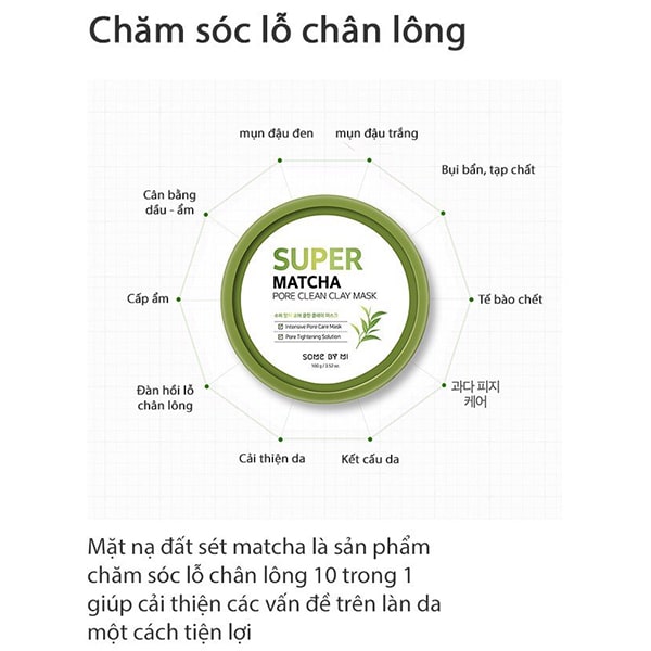 - Mặt Nạ Đất Sét Trà Xanh Giúp Làm Sạch, Thu Nhỏ Lỗ Chân Lông Some By Mi Super Matcha Pore Clean Clay Mask với 102.000ppm hàm lượng nước trà xanh chứa hơn 200 các hợp chất khác nhau trong đó có catechin, các hợp chất polyphenol, flavonoid, hợp chất polysaccharide, axit amin,... Trong đó, đặc biệt là hoạt chất Tannin có đặc tính kháng viêm, kháng khuẩn, làm dịu và có tác dụng hiệu quả nhất trong việc điều chỉnh và thu nhỏ lỗ chân lông và cấp ẩm cho da