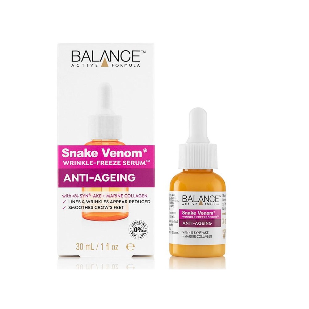 Tinh Chất Dưỡng Da Balance Active Formula Wrinkle Freeze Serum với công thức chứa Syn – Ake, một loại peptide mô phỏng tác dụng của nọc rắn, thấm sâu vào các lớp biểu bì giúp thư giãn và giảm các đường nếp nhăn hay xuất hiện ở vùng trán rảnh miệng và khóe mắt