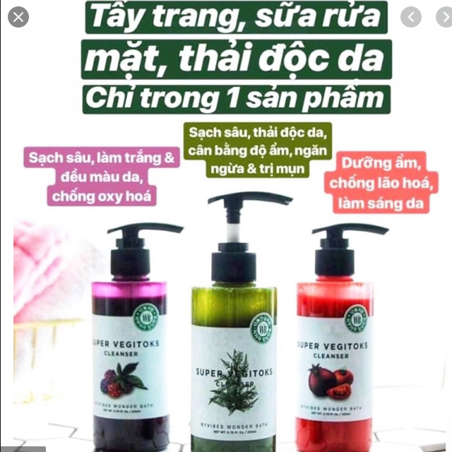 Sữa rửa mặt rau củ Wonder Bath Super Vegitoks Cleanser có công dụng 3 in 1: Tẩy trang + rửa mặt + mặt nạ thải độc tố (xử lý sạch sẽ bụi, mụn, độc chì) trong cùng 1 sản phẩm…