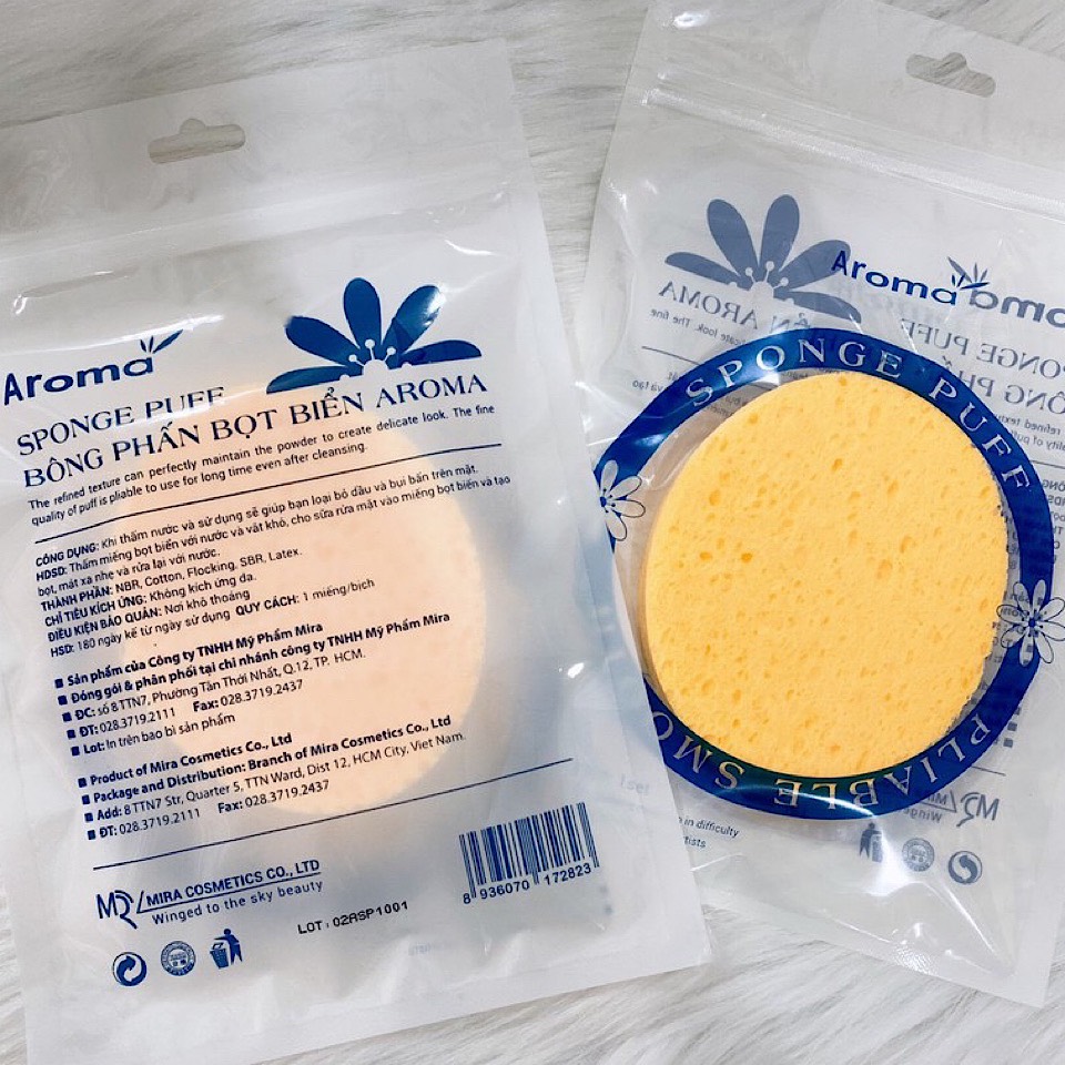 - Hướng dẫn Bông phấn bọt biển massage mặt AROMA ,Thấm miếng bọt biển với nước và vắt khô, lấy sữa rửa mặt lên bọt biển và tạo bọt, mát xa nhẹ và rửa lại với nước.