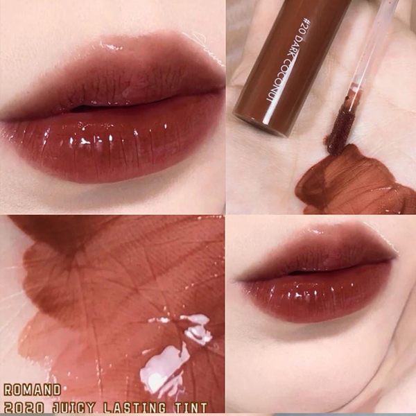 - Son Tint bóng Romand Juicy Lasting Tint có chất son không quá lỏng, khi thoa lên môi có 1 lớp bóng nhẹ giúp môi căng mọng, khỏe mạnh đầy sức sống