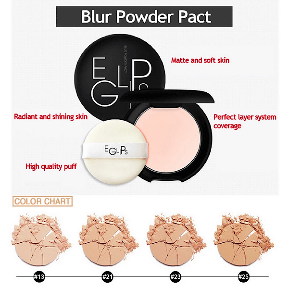 - Phấn phủ Eglips Blur Powder Pact có khả năng Blur (làm mờ) tuyệt vời như chính tên sản phẩm, che phủ hoàn hảo lỗ chân lông, các vùng da không đều màu.