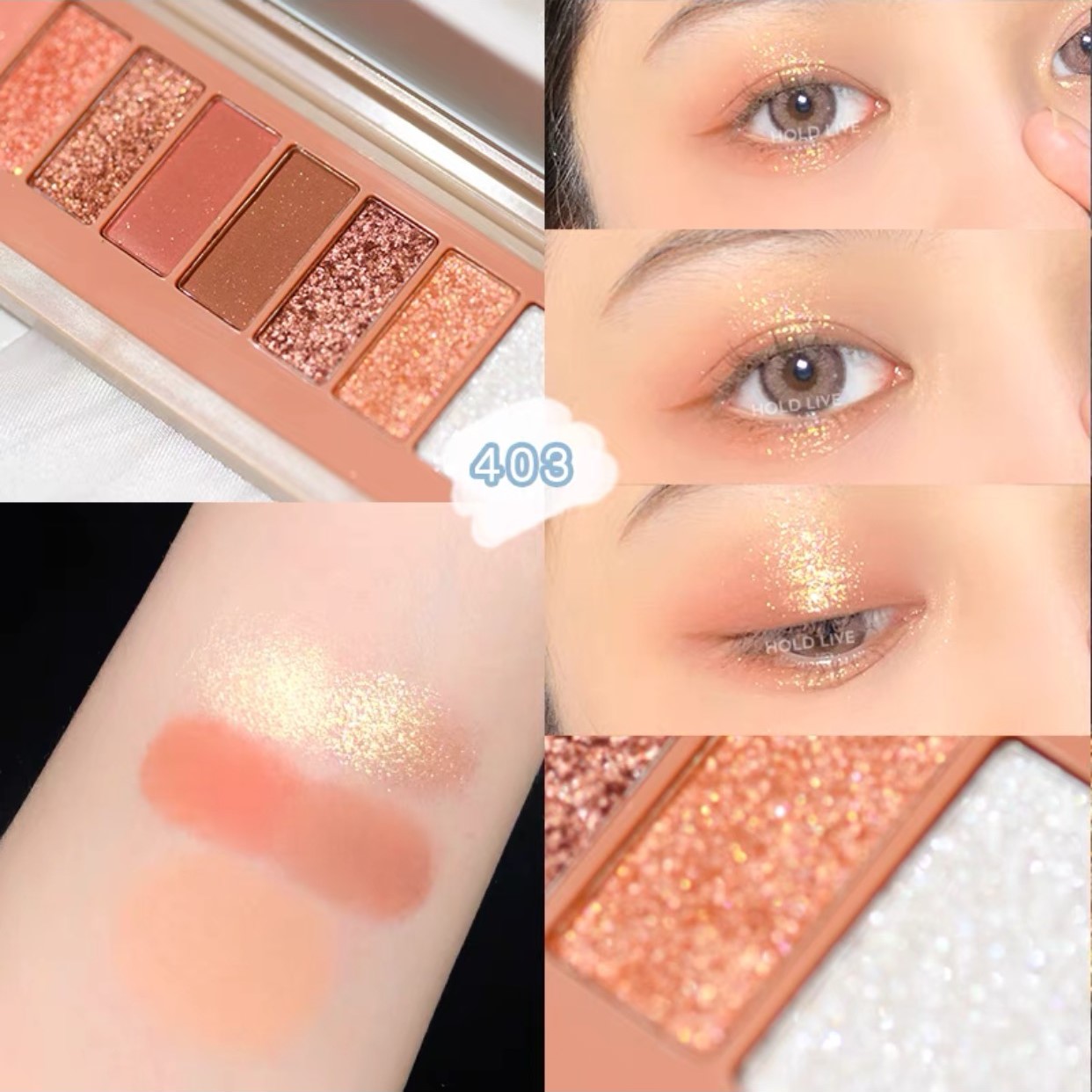 Tông cam đào hồng đất .Bảng mắt mới nhất từ nhà Hold Live, thiết kế cực xinh xắn kèm theo gương tiện lợi, phối hợp 9 ô màu trendy với các chất phấn khác nhau: lì, nhũ, bắt sáng… dễ dàng kết hợp và trải nghiệm nhiều phong cách trang điểm đa dạng.